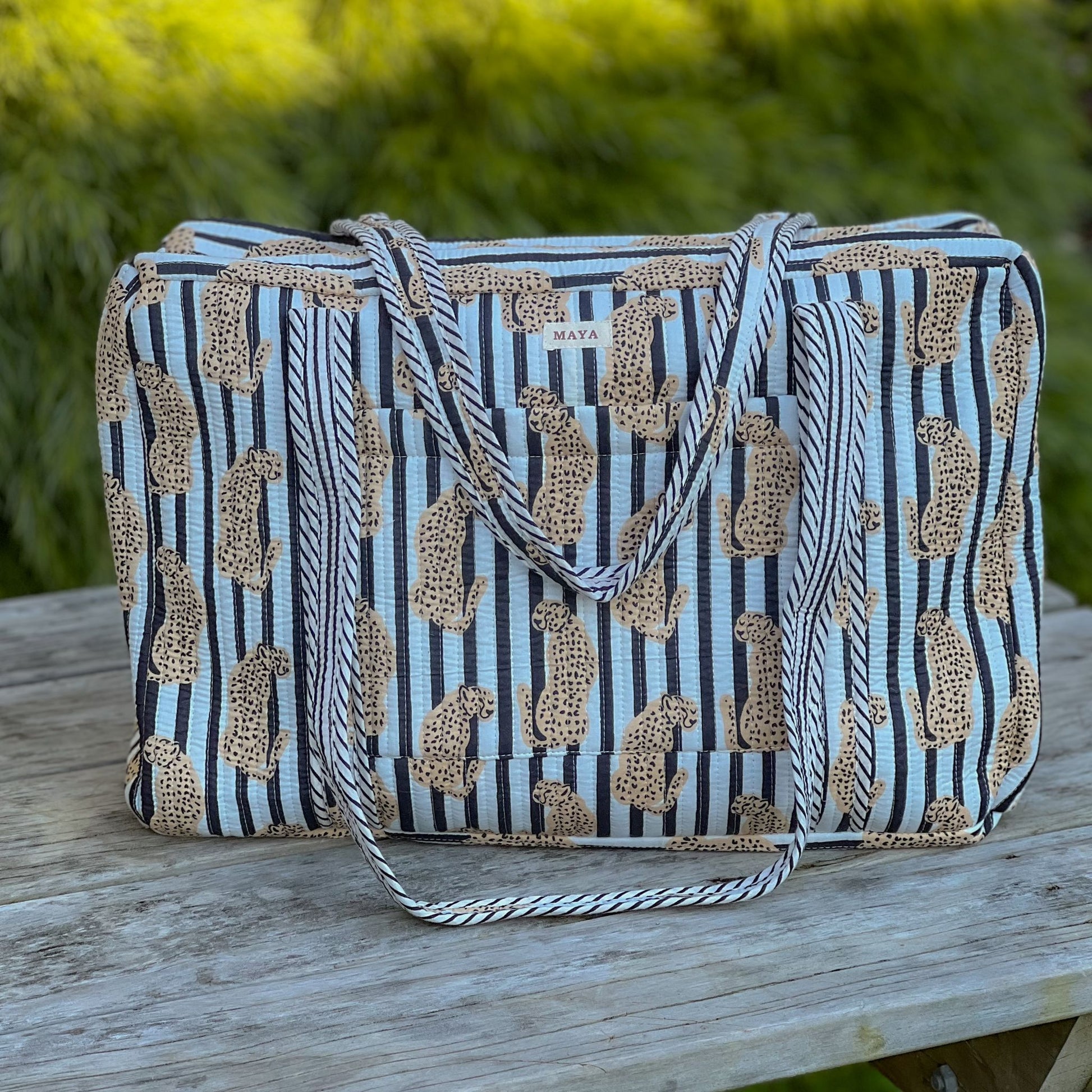 Features: 100% cotton fabric, quilted and lined with complementing lining with outside zipped pocket.