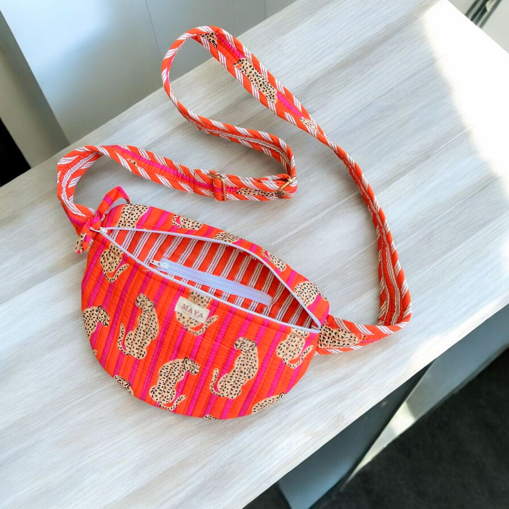 Meet your new favourite "banana/ moon bag" which is designed to bring colour and charm to your everyday look. Carefully handcrafted using soft quilted cotton, this bag is perfect for those who love functional accessories with a touch of personality.