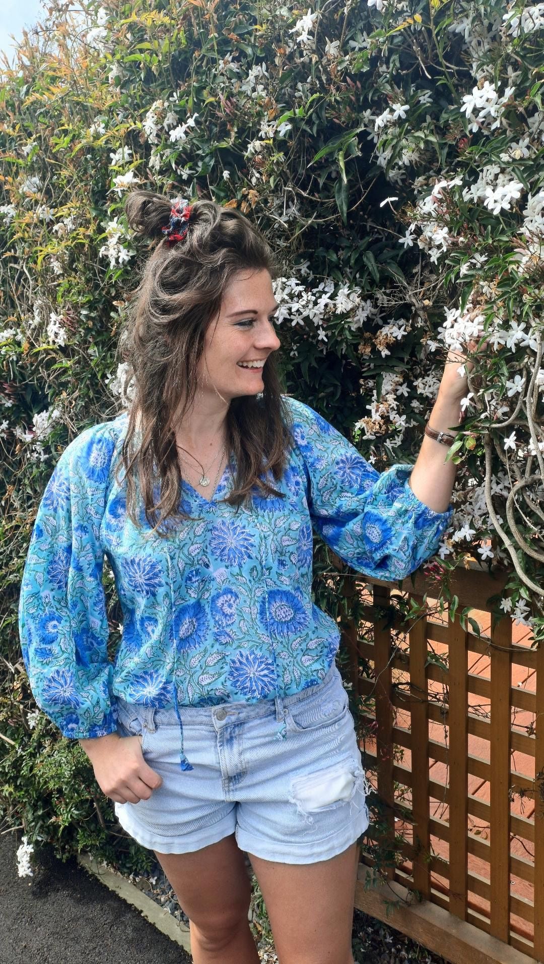 100% soft cotton, hand block printed with natural dyes, relaxed fit (Fits NZ size 10-12), balloon sleeves with gatheted cuffs.